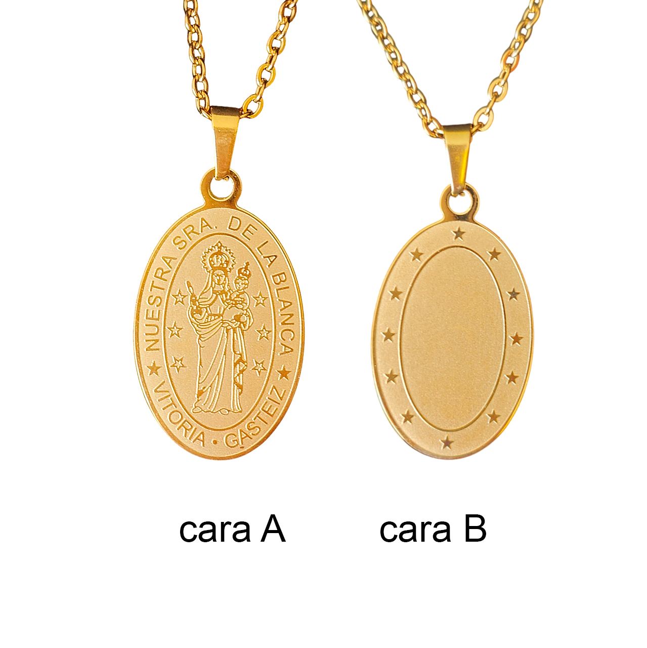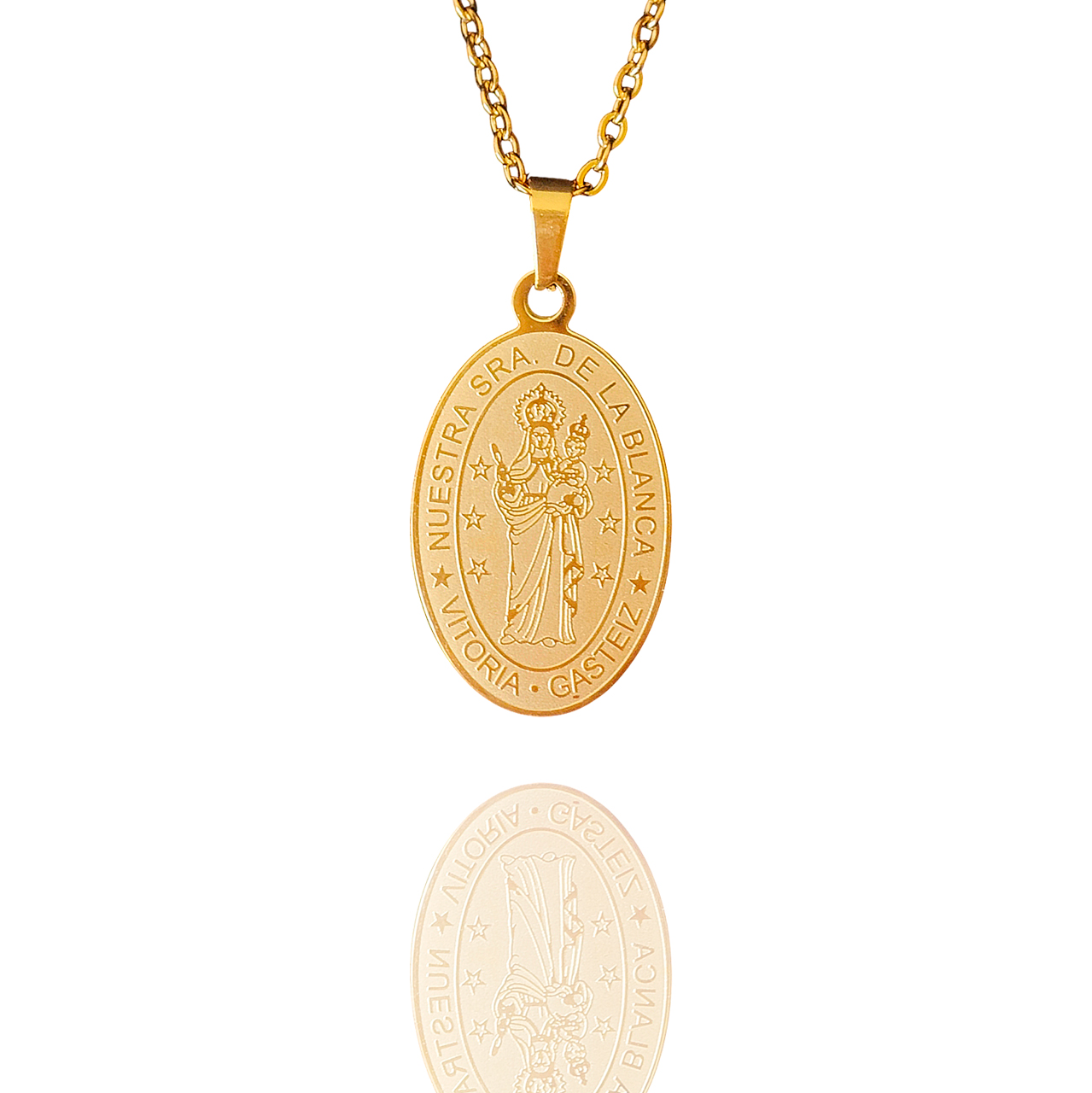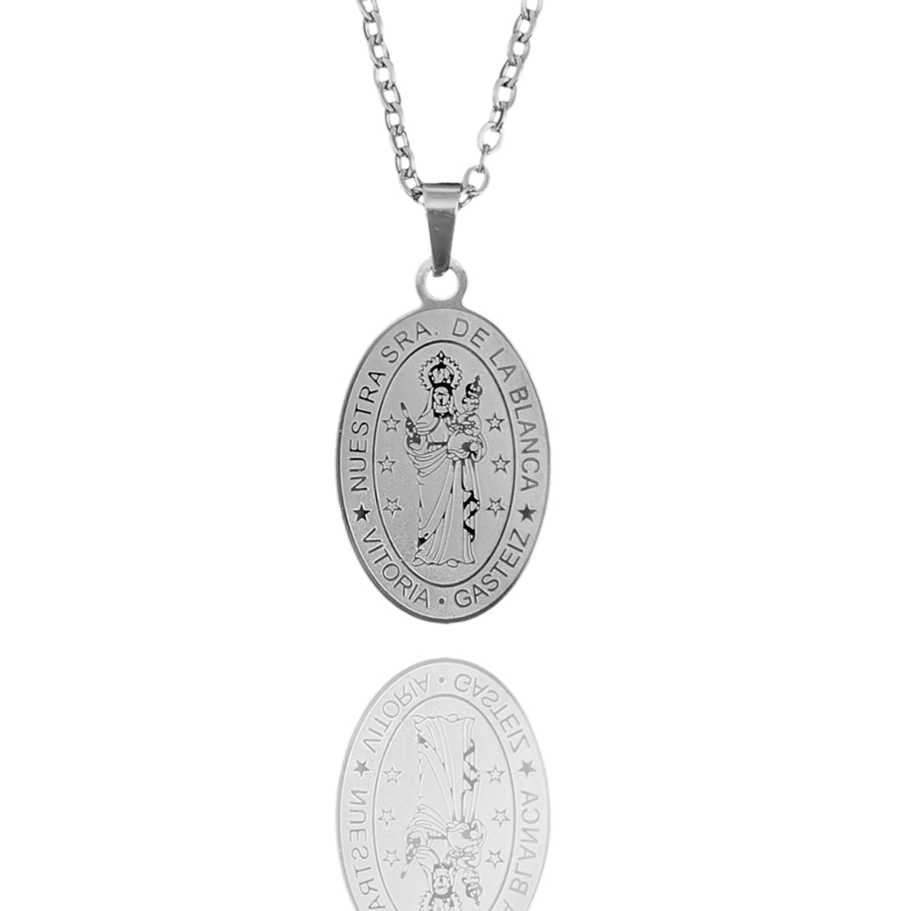 Lleva contigo la devoción y el espíritu de Vitoria-Gasteiz con este elegante colgante de la Virgen Blanca. Fabricado en acero quirúrgico de alta calidad, este medallón ovalado presenta en su cara A un detallado relieve de Nuestra Señora de la Blanca, rodeada por la inscripción «NUESTRA SRA. DE LA BLANCA VITORIA • GASTEIZ» y delicadas estrellas. La cara B ofrece un diseño liso con un borde estrellado, perfecto para grabar con láser.
