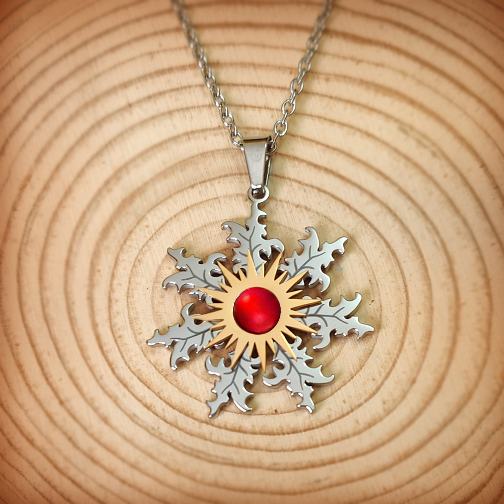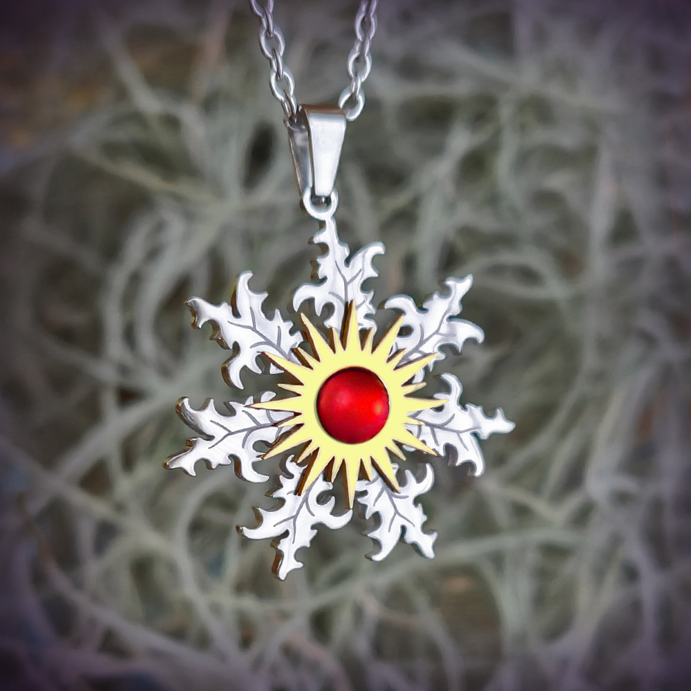 Precioso colgante en forma de Eguzkilore. Según la antigua leyenda vasca, este amuleto tiene un poder protector contra malos hechizos, brujerías, enfermedades, tormentas, tempestades y rayos.