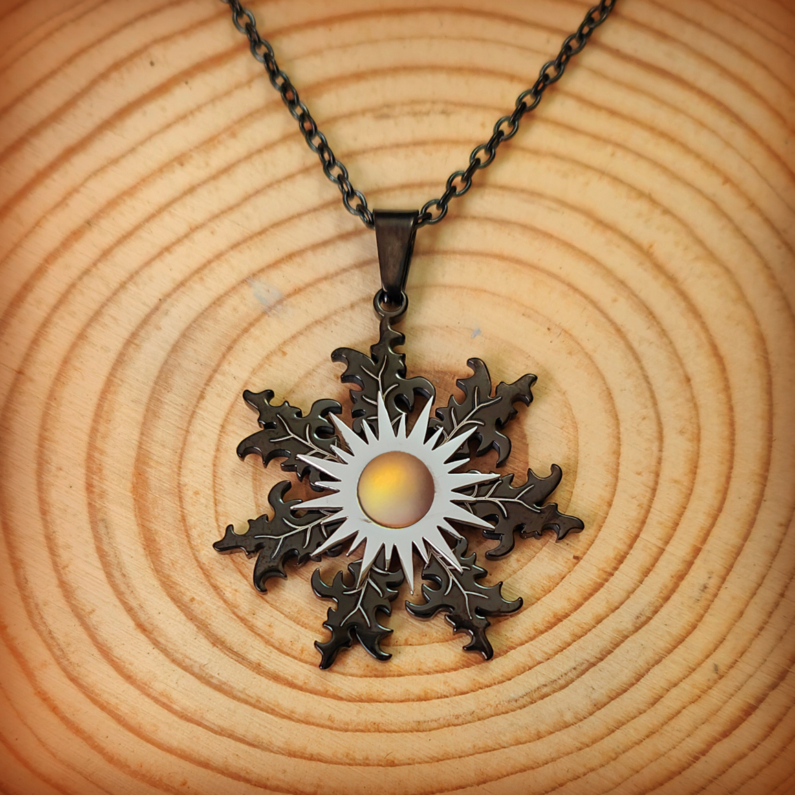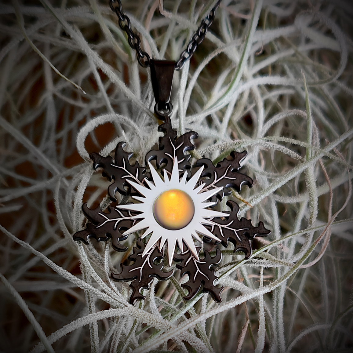 Precioso colgante en forma de Eguzkilore. Según la antigua leyenda vasca, este amuleto tiene un poder protector contra malos hechizos, brujerías, enfermedades, tormentas, tempestades y rayos.